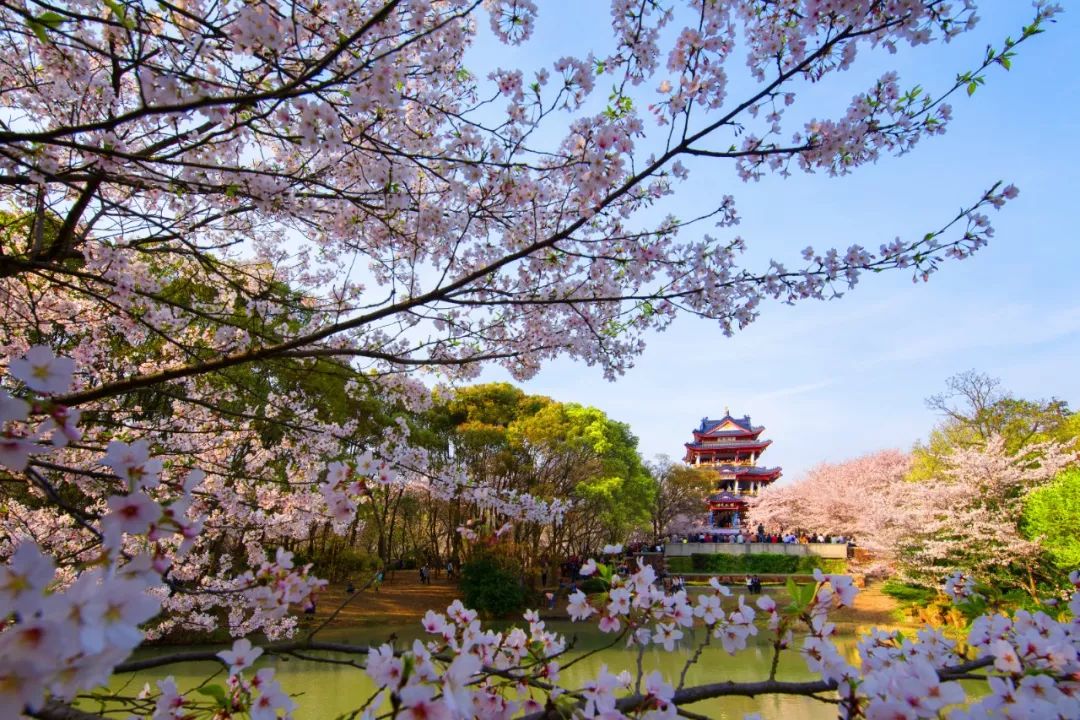 以碧波万顷的太湖和江南园林建筑为背景,无锡鼋头渚的樱花开成连绵无际的云蒸霞蔚。
