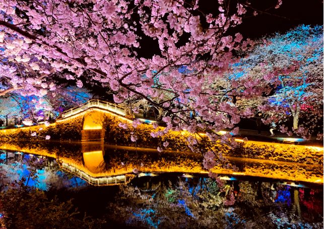 但是如果说赏樱最壮观的时节,那莫过于染井吉野樱绽放的季节了(一般为三月中旬至月底)。以花朵硕大、花簇紧密著称的吉野樱开成了连绵的“樱花海”,那场景不亚于东京赏樱圣地——上野公园。繁花似云蒸霞蔚,倒映湖面,和楼台亭榭、长堤拱桥相映成趣,随风飘落的花瓣像下起一阵樱花雨,徜徉树下美不胜收。" w* Y3 [- s F/ g