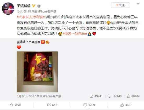 23日早,黄子韬爸爸转发微博表示自责,称:“感谢海浪们对我这个大家长提出的宝贵意见,因为心疼他三年来没有休息过一天,所以这次放了一个长假,看来我是错的。”