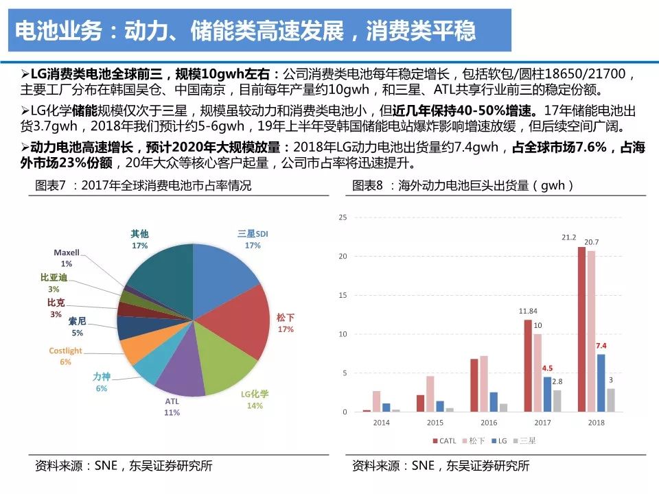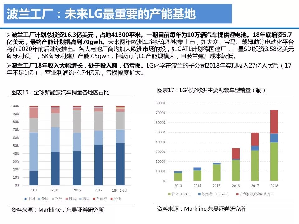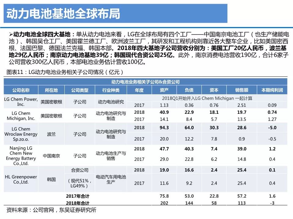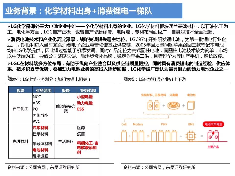 7 O* i* e2 Y9 \' J& Z& GLG化学以材料公司出身,电池业务为集团近几年发展唯一重点。LG化学2018年总营收约1630亿,四大板块,化工材料、电池板块、信息电子材料、生命科学,占比分别为64%/24%/10%/2%。公司18年营收增长主要来自电池板块,电池板块实现收入384亿元,同比增速达到46%。" p7 r% X6 Q; c U8 t