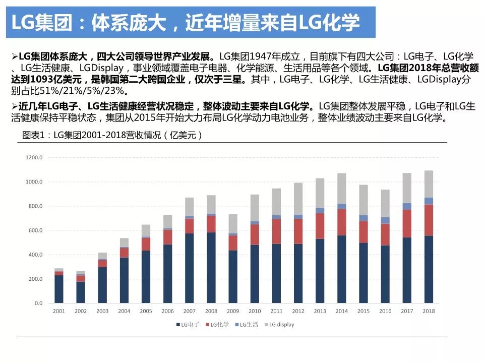 与其相忘江湖,不如点击“蓝字”关LG集团体系庞大,四大公司领导世界产业发展。LG集团1947年成立,目前旗下有四大公司:LG电子、LG化学、LG生活健康、LGDisplay,亊业领域覆盖电子电器、化学能源、生活用品等各个领域。LG集团2018年总营收额达到1093亿美元,是韩国第二大跨国企业,仅次于三星。其中,LG电子、LG化学、LG生活健康、LGDisplay分别占比51%/21%/5%/23%。