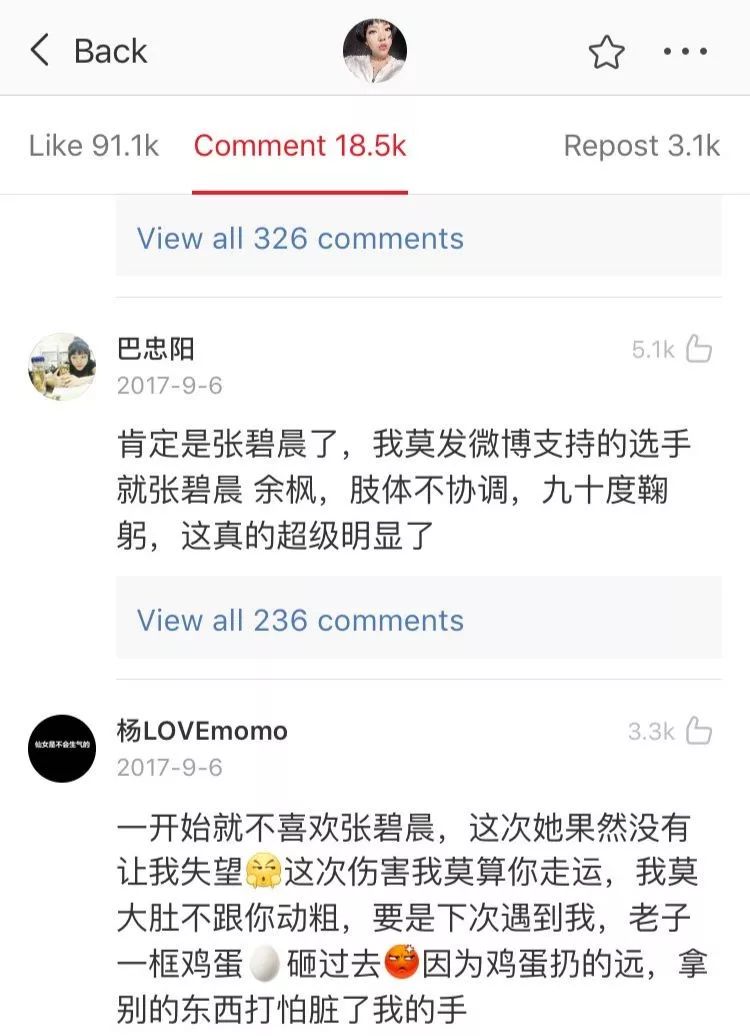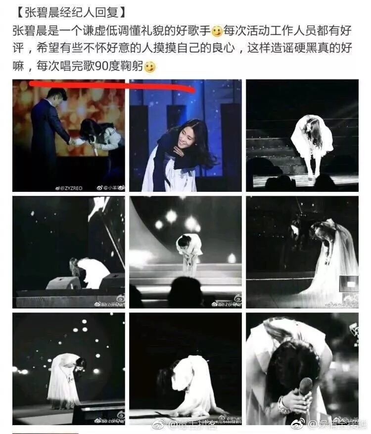 虽然微博中并没有指名道姓,但跳舞肢体不协调、90度的大鞠躬,这些都和同样是《中国好声音》学员张碧晨有些相似。