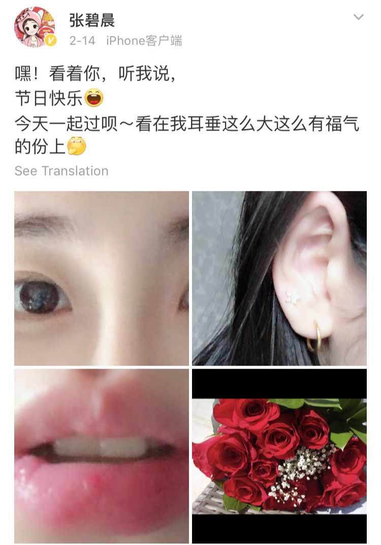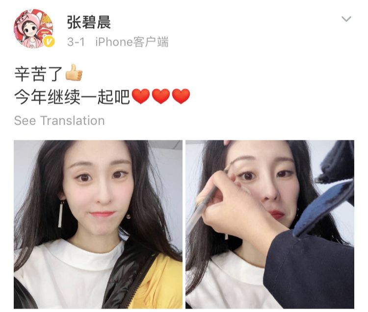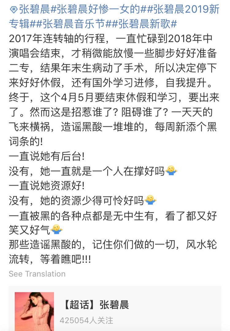 $ |5 s0 s: y' M% T" ~1 x再看看张碧晨本人的微博,大部分都是发发自拍,和粉丝交流感情而已。