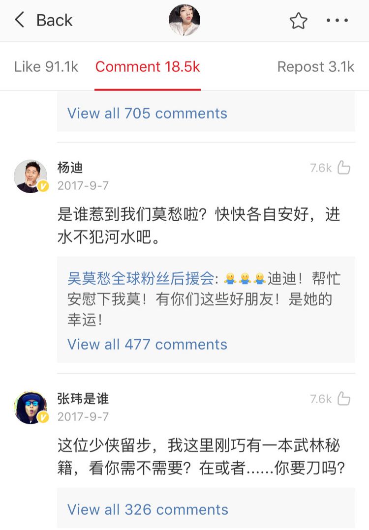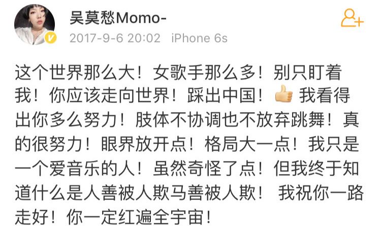 在2017年的时候,吴莫愁曾经连发两条微博, 说有人在背后搞小动作。' W; t2 Q* D" q" s