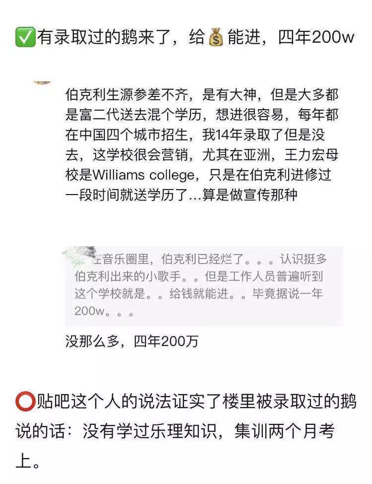 目前王源考伯克利这件事儿已经发展到大家质疑伯克利音乐学院的含金量,鹅组已经开始有人爆料伯克利生源参差不齐,很会营销,给钱就能进,还证实考前只集训了两个月,没学过乐理知识就拿到了伯克利录取通知书。