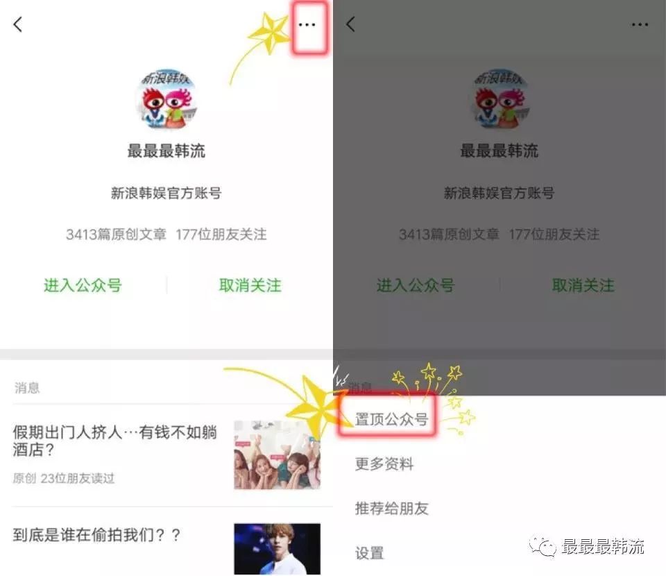 大家点击【最最最韩流】的蓝字或者头像就可以进入我们的单独页面,然后按照下图所示将最韩流设为星标。