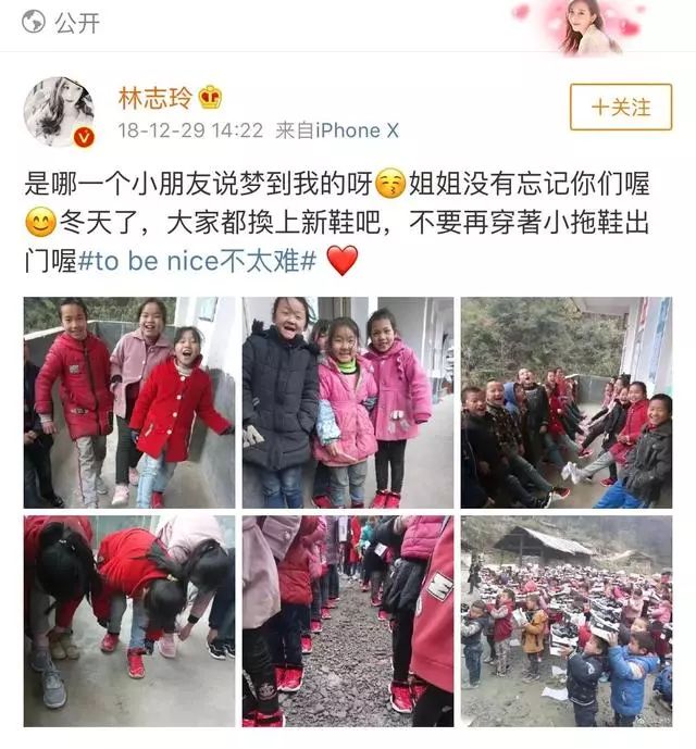 志玲姐姐在微博中也时常晒出自己做慈善的照片,之前网上有图片曝光山区的孩子大冬天穿着拖鞋上学,林志玲立马就买了一大批鞋子送去。+ y9 O4 x2 X! J$ N