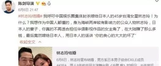 但林志玲官宣嫁人的一刻,内地就有导演宣称要“封杀”林志玲,而且还得到了一些网友的支持。