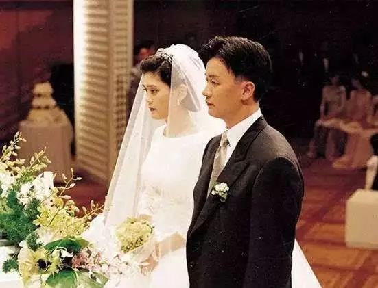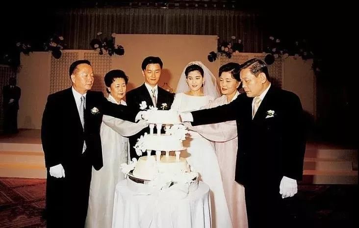 不管怎么样,经过暗戳戳的四年恋爱后,两人于1999年结婚了,这结婚当天的照片,要不是新人笑的开心,都容易让人误会,双方家长脸太黑了。