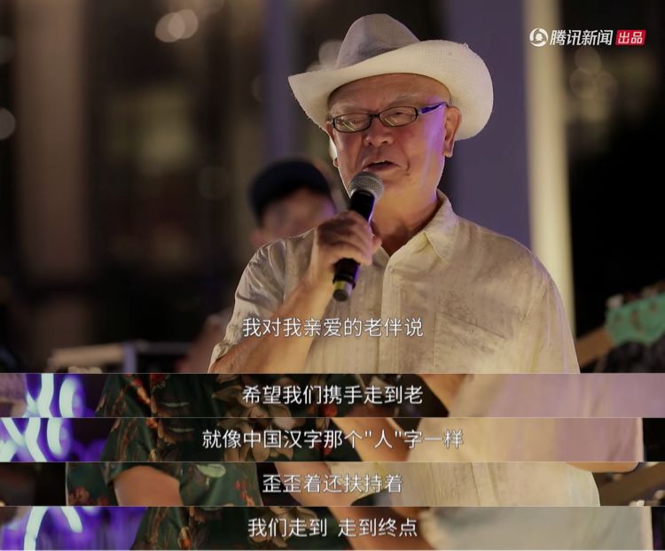 张爷爷回答:“我对我亲爱的老伴说,希望我们携手走到老,就像中国汉字那个‘人’字一样,歪歪着还扶持着,我们一起走到终点。”/ [$ W6 H }+ V( p+ c& B
