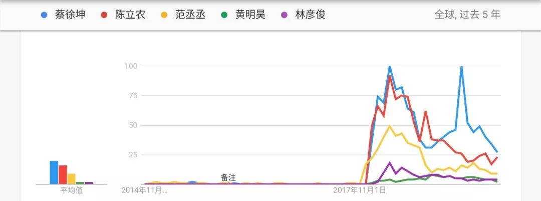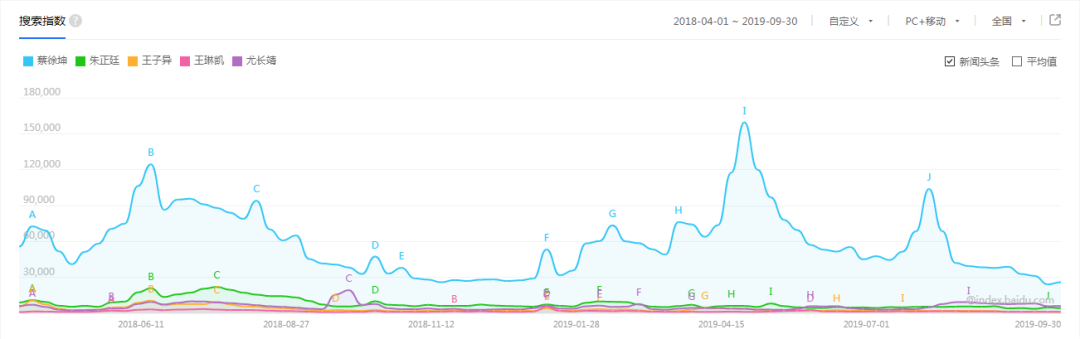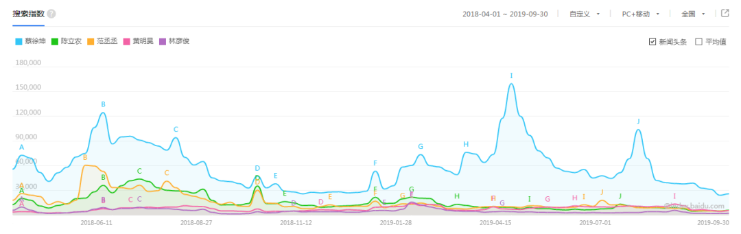 百度指数显示,除蔡徐坤外,其他成员搜索指数在达到波峰后,又渐趋于一条水平线。