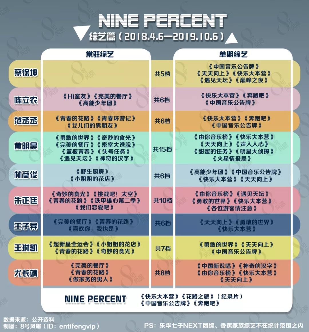 综艺方面,成员以个人身份上了不少综艺,既有网综,也有台综;既有刷脸的国民综艺《快乐大本营》,也有近几年流行的真人秀慢综艺。