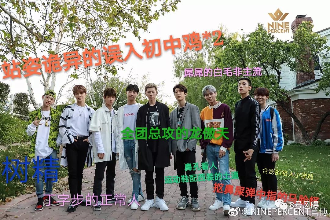 ! q3 n3 Z) V4 m 如果哆啦A梦的时光机真的存在,让我们先回到一年半前的日日夜夜,100个练习生来自天南地北,粉丝其实也同样来自不同的饭圈和次元。每个人的经历或大不相同,但又殊途同归地,因为某个契机和某个时间点,拥有了共同身份——NINE PERCENT的团粉“NINE's”。 谢停风(化名)最开始只是被C位蔡徐坤迷住了,她在站外循环观看了99遍公式曲《eiei》,自然而然便打开了《偶像练习生》,看了两期后就决定入坑,“一个不喜欢的都没有”; 小君(化名)本来是一名“Xback”(张艺兴粉丝),偶像上节目当导师,粉丝自然也要大力支持,“我倒要看看张艺兴选了些什么人出来”。 而要等到真正入坑,则是成团之后9个人去洛杉矶集训,粉丝在合照上疯狂P上沙雕语录:一身黑的蔡徐坤是“龙傲天”,穿着绿色纹路外套的王琳凯则是“树精”……" Z: X7 `/ u6 C4 e f8 ~5 U