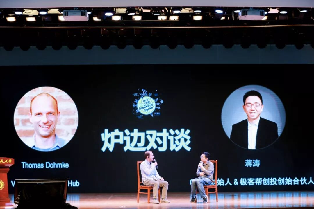 2 S. a6 [& z7 B/ f% B9 b在由开源社主办,在华东师范大学以「开源无疆、携手出航」为主题召开的 2019 中国开源年会 (COSCon'19)上,CSDN 创始人&董事长、极客帮创投创始合伙人蒋涛携手 GitHub 副总裁 Thomas Dohmke 重磅展开「炉边对谈」,围绕着技术社区及开源的发展进行了深度的探讨。