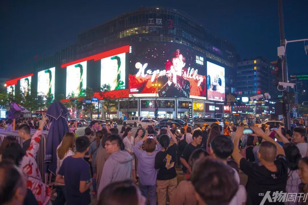 2019年10月5日,杭州,人们举着手机拍摄粉丝为肖战投放的庆祝生日广告 * P% O" y' d9 x