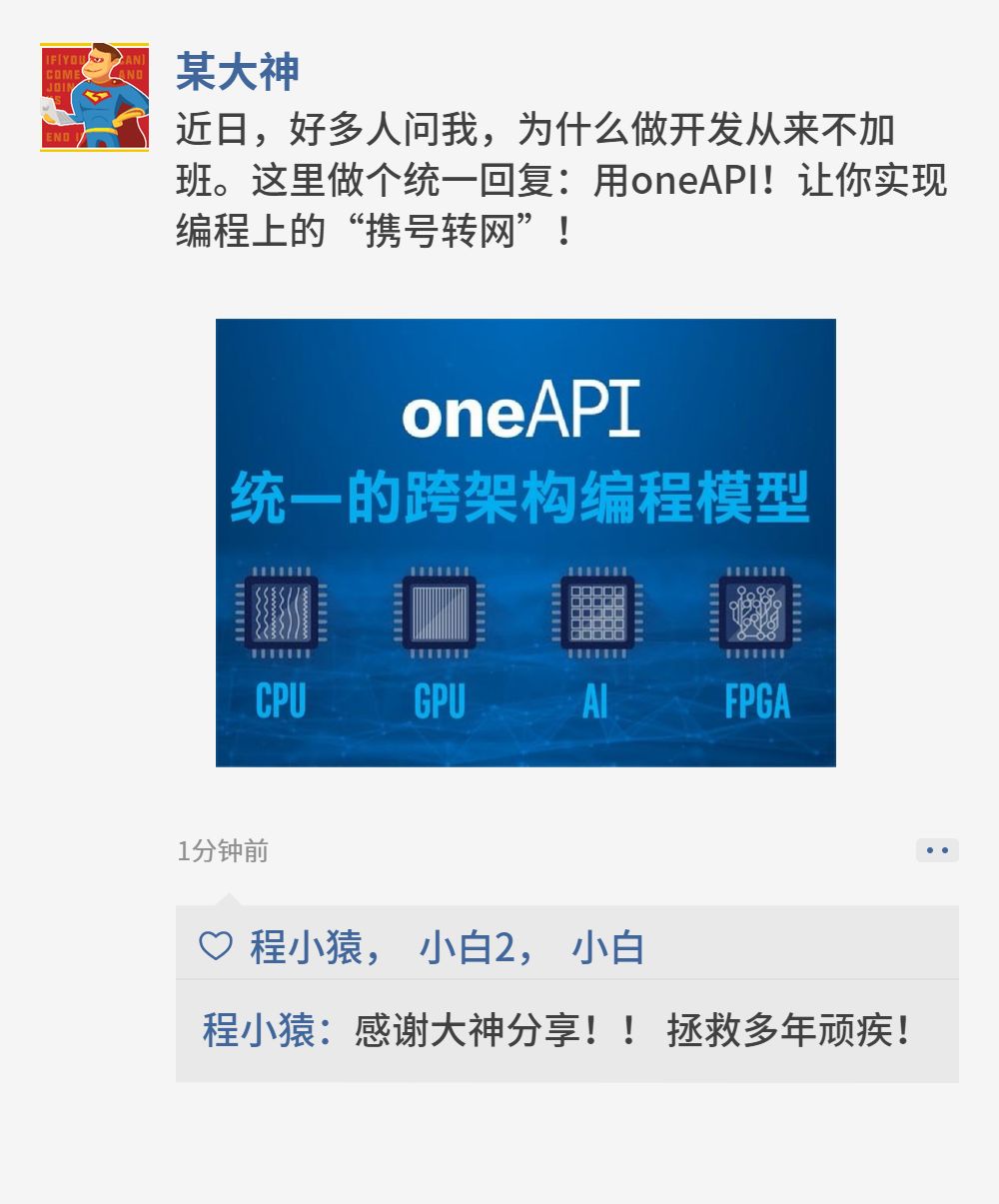 ' u1 T( [' w& O话说回来,谁说程序员工资高,都是加班加出来的?工具用得好,下班回家早!oneAPI用起来!' Z0 c7 V3 m4 V$ G