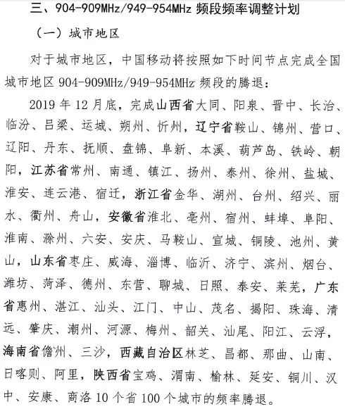 : |0 f* ~* [2 |3 b1 z& N根据此前传播的频率调整时间表:在城市地区,中国移动2019年12月底将完成山西、辽宁等10个省100个城市的频率腾退;2020年3月底完成天津、河北等23个省209个城市的频率腾退;2020年5月底完成石家庄、沈阳等39个城市的频率腾退;在县及以下行政区域,2019年7月底、8月底分别完成吉林省和贵州省(县级市)及以下行政区域的频率腾退;9月底完成宁夏、四川等8个(自治区)县(县级市)及以下行政区域的腾退;11月底前完成全国范围内县(县级市)及以下行政区域的频率腾退。, P6 Z0 m& K* B, z5 \% L; |$ V