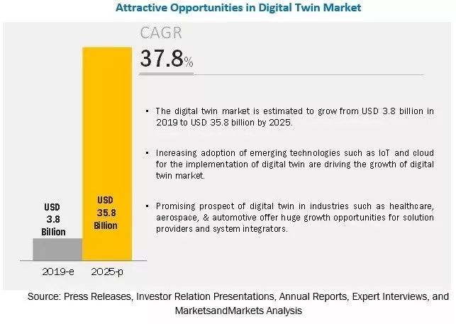 数字孪生市场估计将从2019年的38亿美元猛增到2025年的358亿美元,年复合增长率(CAGR)高达37.8%。推动数字孪生需求增长的几个因素包括:越来越广泛地采用物联网和云计算之类的技术用于实施数字孪生,以及数字孪生在医疗保健、航空航天、国防以及汽车及交通运输等行业有广阔的应用前景。
