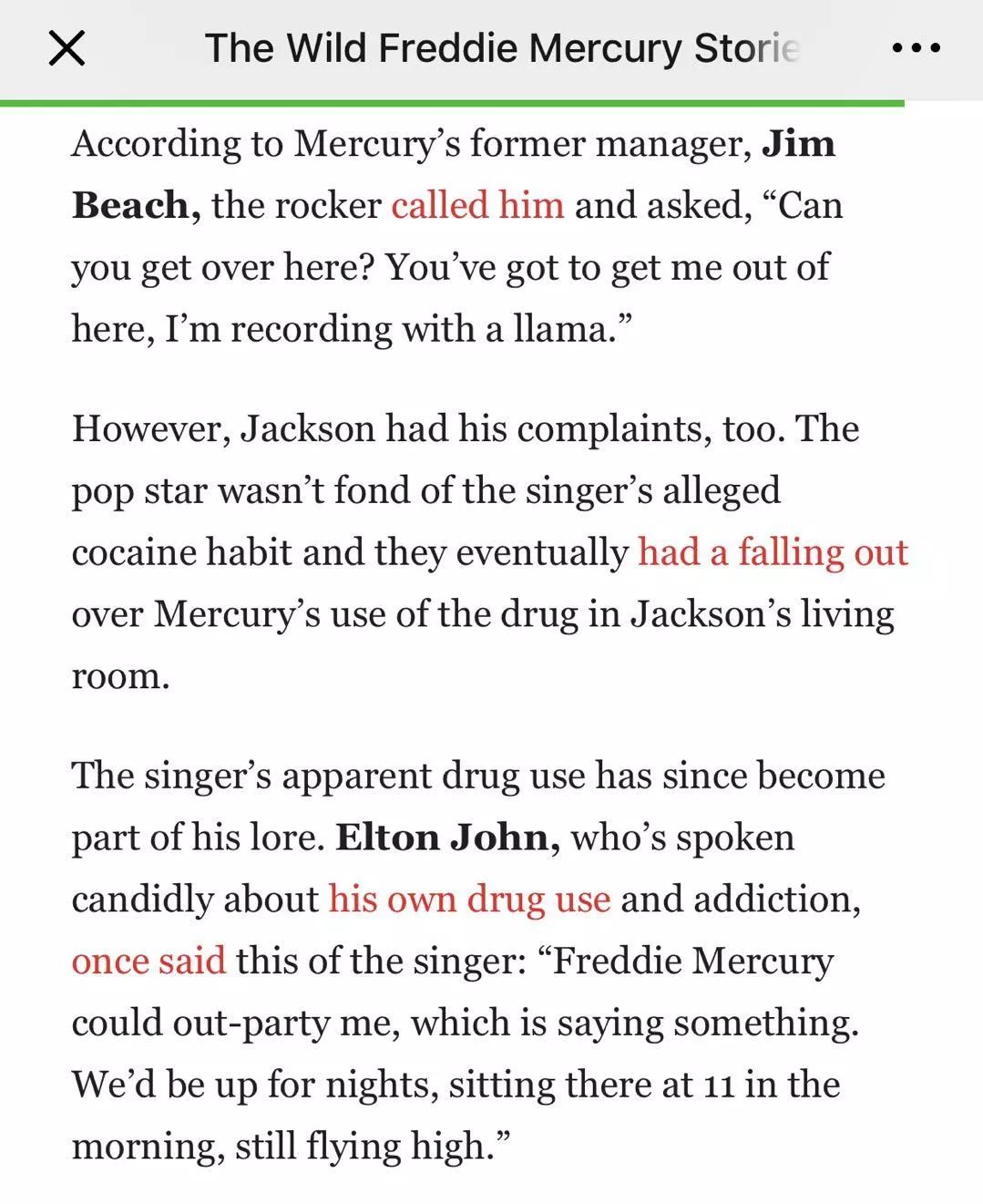 - I$ [0 g0 {& q* O& q' A不止在一篇关于皇后主唱的文章里有提到过,佛莱迪·摩克瑞对可卡因情有独钟,甚至于当年他与迈克尔·杰克逊那次彗星撞地球的合作中,两个人分道扬镳也有很大原因是毒品。7 p+ `6 x' c; i" ~$ L" E3 i, f