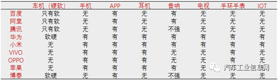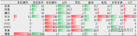 “车+手机+万物互联”逐渐成为发展趋势,互联互通的终端设备从而显得尤为重要。从目前相关竞企实力来看,百度、阿里、腾讯等互联网公司在车机软件方面的实力毋庸置疑,而在硬件终端上的能力相对缺失;华为、小米、VIVO等手机厂商在终端设备如手机、耳机、手环手表等方面均有技术储备,而在车机系统方面关注较少。专注车联网企业如博泰、亿咖通等则注重在车机硬件、操作系统、应用软件、云服务方面实现兼容各种生态应用资源。就目前技术侧重点来看,博泰与华为、小米、VIVO等手机厂商恰好能形成优势互补。各厂商专利技术构成见图6所示。3 ^0 A. T2 C# a, N