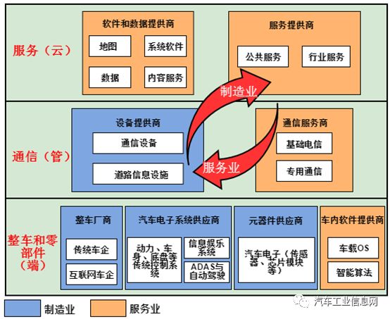 车联网已经形成跨界融合的生态体系。随着“万物互联”理念的兴起,车联网吸引了越来越多非传统汽车行业的创新主体参与车联网行业的生态构建及市场竞争。整个汽车产业的“朋友圈”已经迅速扩大,产业生态正在发生巨大的变化。车联网产业角色丰富、产业链长,跨越服务业与制造业两大领域,服务业、制造业相互渗透,跨界融合特征突出。从“云”、“管”、“端”三个层面分析车联网产业链角色,“云”层面以服务业产业角色为主,“管”层面制造业和服务业产业角色比较均衡,“端”层面以制造业产业角色为主。图1为车联网产业链示意图,呈现了车联网产业链条的主要环节和产业角色。