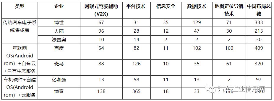 1 f7 C: I, h; M; ^, q- U ^企业仍需重视知识产权保护,尤其是加强重要技术领域的专利布局。目前典型优势企业的专利布局中,国内不同类型企业已形成差异化发展,形成良性竞争;整车企业着重在网联式驾驶辅助方面布局,零部件TIER1着重在车机车联网方面布局、互联网BAT企业借助优势着重在软件及云端方面布局,车联网企业如博泰着重在互联互通及手机车联网方面布局。