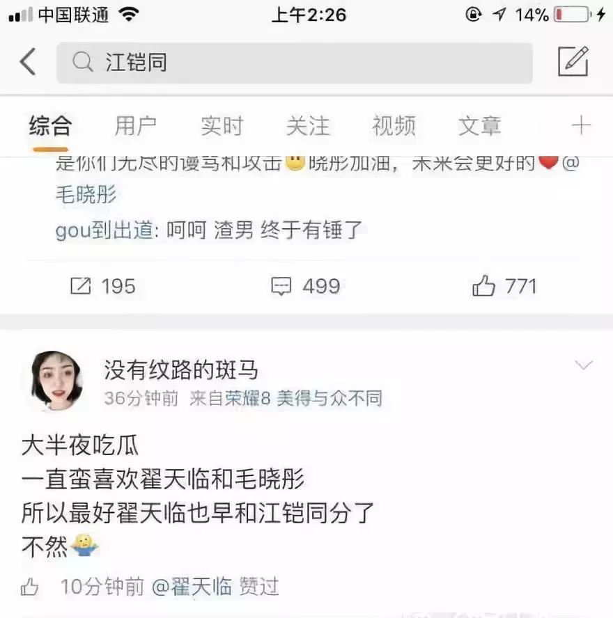 , Q- M P: z3 W0 J网友讨论时,免不了带上了江铠同的前男友翟天临,可谁知,翟天临一言不合就亲自下场回复:- n3 G+ A$ w9 S3 }