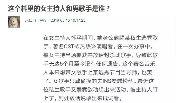 4 c) V9 h: X# e' s这不,三月份的时候,有人在豆瓣上发帖,po出了一条营销号的爆料,内容大致是一位选秀歌手和女主持人的老公有一腿,被女主持人捉奸,还被封杀了。; O: H, c; V- c$ b( @3 F