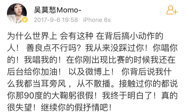 ( e; q1 n$ q( o% m在2017年的时候,吴莫愁曾经连发两条微博, 说有人在背后搞小动作。5 O4 W6 g+ P1 i! n; ?