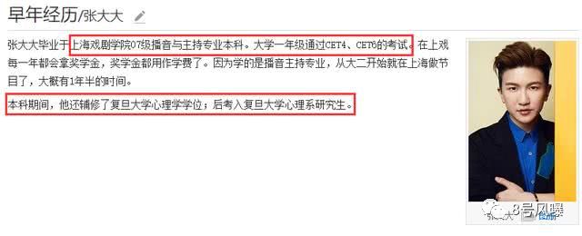 $ a& j; M! \1 } h3 l! l( U6 T) w- E别看张大大其貌不扬,然而他也是隐藏的一枚学霸,本科是上海戏剧学院,学习播音主持的同时又辅修了复旦心理学,研究生又继续在复旦学习心理学。: R+ i2 S% N0 B: U b