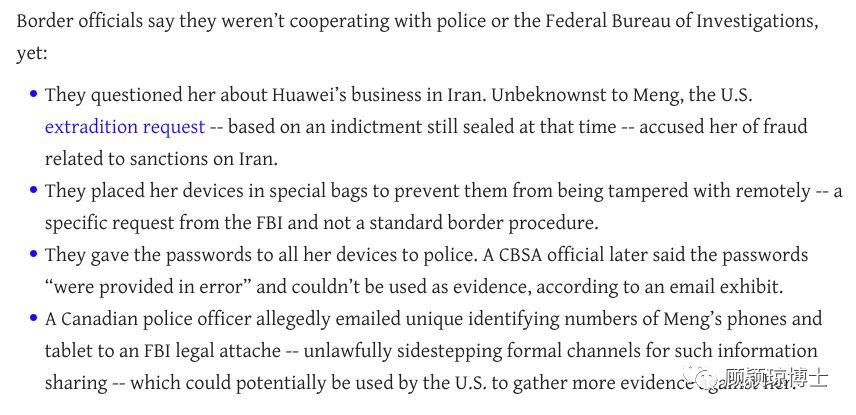 3.加拿大海关把密码写给了加拿大皇家警察,而此后又被“错误”的提供给了FBI,因此所有孟晚舟电子设备中的证据应该无效。