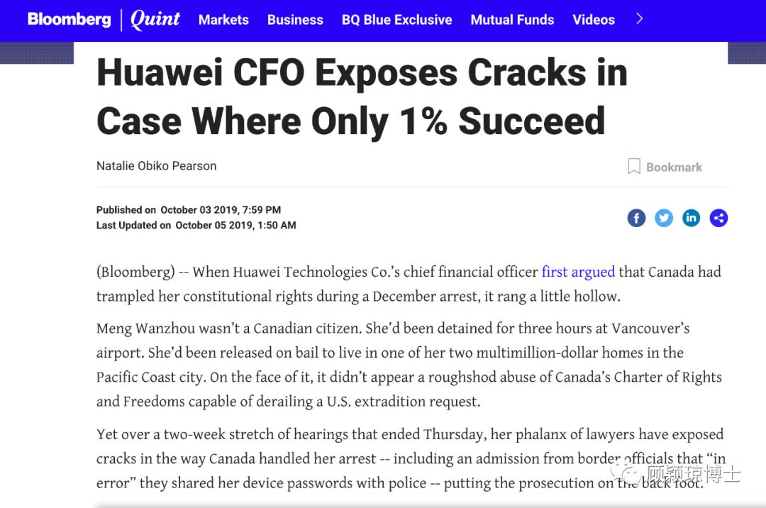 美国资深媒体布隆伯格直接了当的指出,见下图,孟晚舟想依靠这个办法脱身成功率只有1%,而99%的可能性,孟晚舟依然要被引渡美国。顾颖琼博士认为哪怕只有1%的机会,孟晚舟也要努力尝试,几千万美金的律师费拖也要拖到特朗普下台。; C% l) D- l- f r; G7 d; _