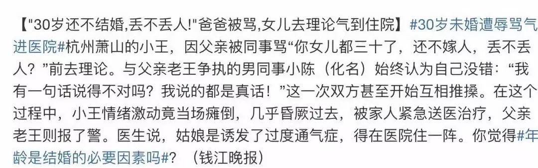 都2019年了,没想到不结婚, 竟然还能被人当作软肋来辱骂的借口。类似的情景,其实也时常发生在我们的现实生活中:别说是30岁,哪怕你刚刚过了25岁, 逢年过节走街串巷见亲戚朋友的时候,都会收到一连串的灵魂拷问。
