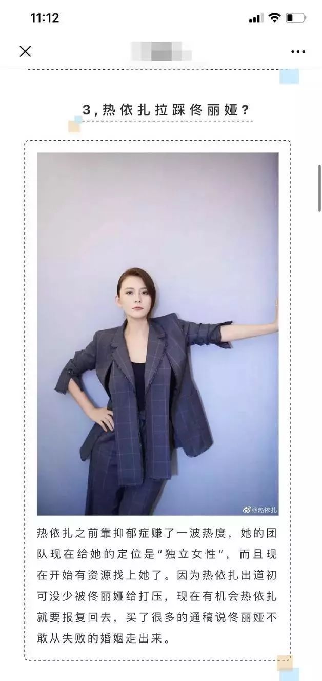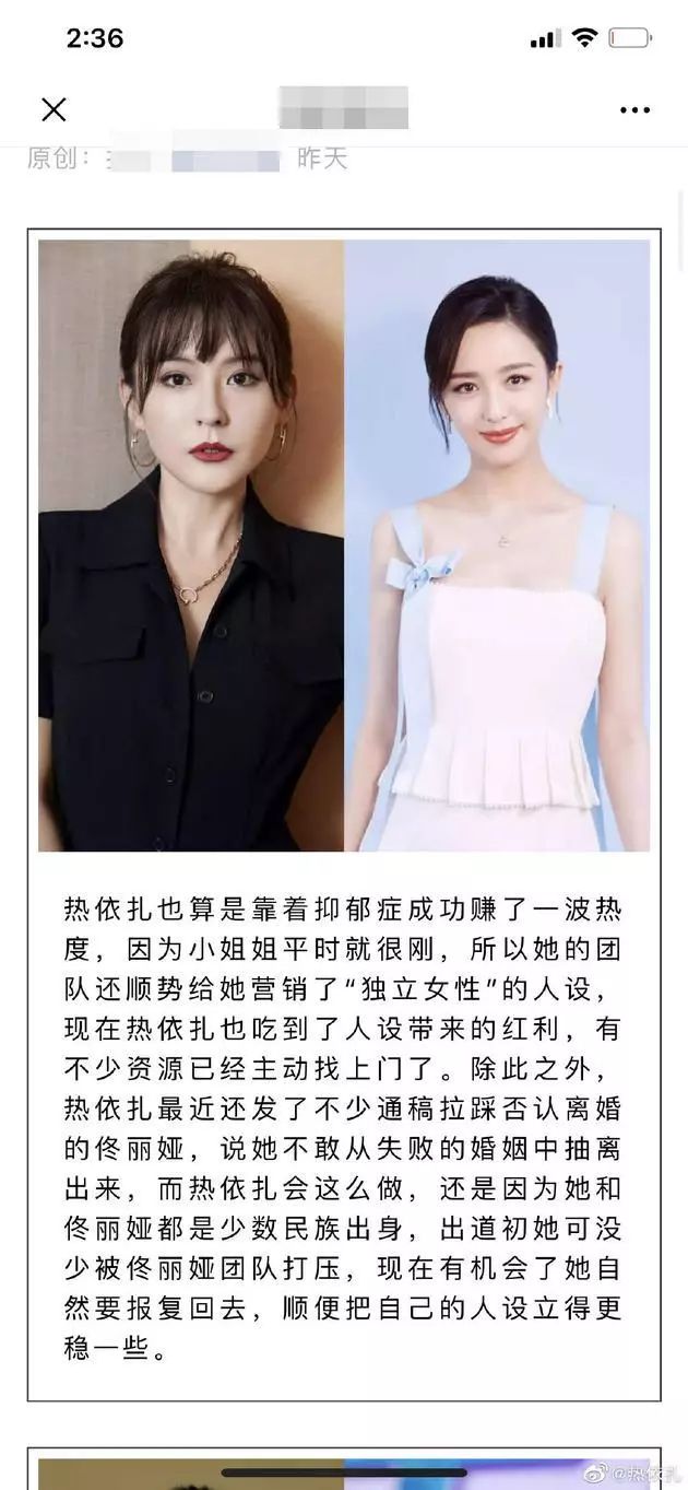 6 G. f8 s {7 ~事件的起因,就是有两个营销号发文,声称:当初热依扎出道的时候,被佟丽娅欺负,于是热依扎现在就发了一轮稿子,说佟丽娅不敢从失败的婚姻中脱离出来,各种搞事情。