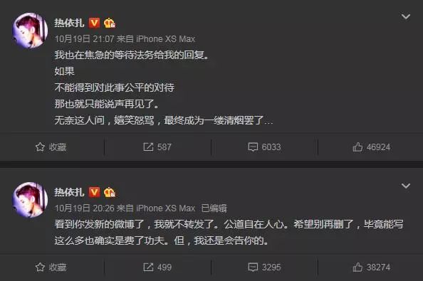 10月14日,某网友在社交平台上就雪莉事件对她冷嘲热讽。她二话不说,工作接发表声明要追究其法律责任。即便事后该网友删贴道歉,可热依扎依旧在10月19日发文表示不接受道歉,依旧会告该网友。+ ]; S8 k2 e% n: f