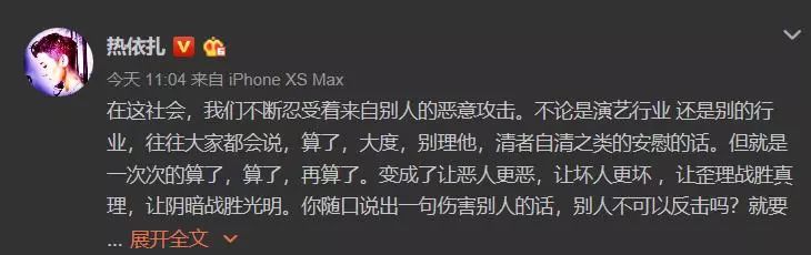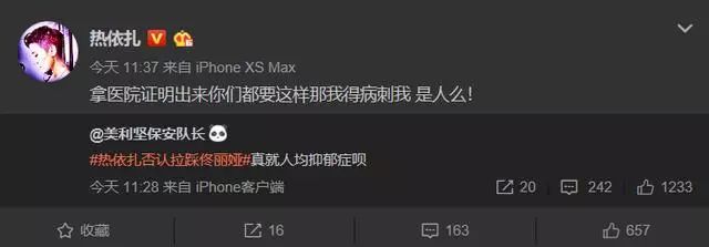 到了下午热扎依终于停止转发,并再次置顶长文,直言自己不是圣人,更有捍卫自己的权利。并指出自己转发的人一个个删除了言论,已经说明了问题。$ q# U+ Z1 Z0 |- Q% {