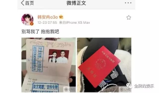 就在今天早上,韩安冉突然无预警的发布了两条微博,其中之一,是晒出了自己的离婚证书,在上面有清晰的蓝色印记标注着双方离婚,证件失败的字样。而韩安冉也是配文:别骂我了,抱抱我吧