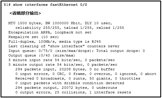 - G# d4 \4 j1 _ 请参见图示。网络技术人员使用命令 show interfaces fastEthernet 0/0 对以太网网络中的连接问题进行故障排除。根据图中的部分输出可得出什么结论?