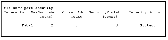 Option 1. 无法全局启用端口安全性。应该使用 switchport port-security 命令手动保护所有活动的交换机端口,管理员可以使用该命令控制允许访问端口的有效 MAC 地址的数量。如果发生违规,该命令不会指定将采取的操作,也不会改变填充 MAC 地址表的过程。+ o! {) t, j0 B1 j" C5 _
