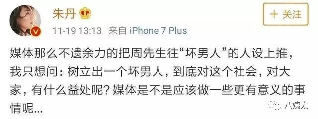 * C1 B$ ]$ i9 {朱丹也像洪欣维护张丹峰一样,站出来维护周一围,并把炮火对准了媒体,指责媒体不遗余力想把周一围塑造成“坏男人”↓↓↓9 P- p2 ^+ n( G* ` b