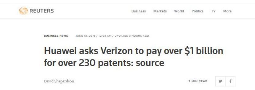 《华尔街日报》称,其消息来源于“了解此事”的“知情人士”。此人透露,华为方面在今年2月时给美国通信运营商威瑞森公司及其20多家供应商发去了信件,要求威瑞森为其所使用的超过230项专利支付超过10亿美元的使用费。
