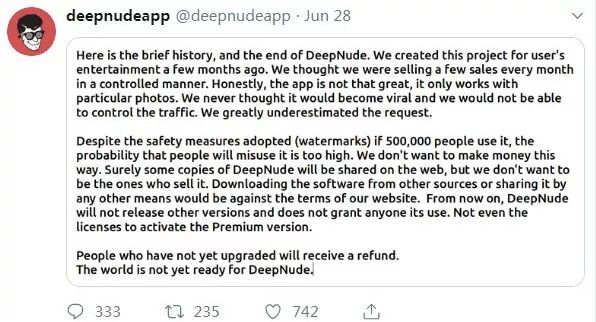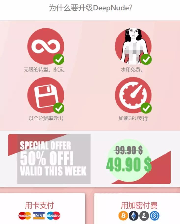再说回DeepNude,作者Alberto(化名)是出于有意思、好奇的原因制作这款软件。讲真,这样的解释谁信?赚钱才是软件制造的首要目的。