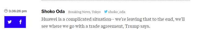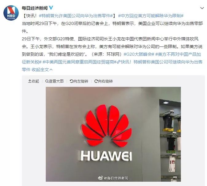 在日前的G20会议上,中美双方进行了一个多小时的会谈,美国宣布暂停向中国商品继续征税,双方重启谈判。在会后,美国总统特朗普表示,允许美国企业继续向华为出售零部件。