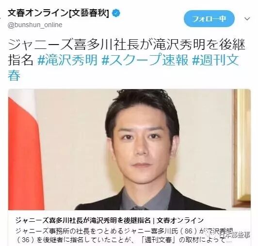 , w. {) @3 c0 Q) Q3 S) d而就在去年8月,喜多川社长指明了泷泽秀明会成为最后的继承者。