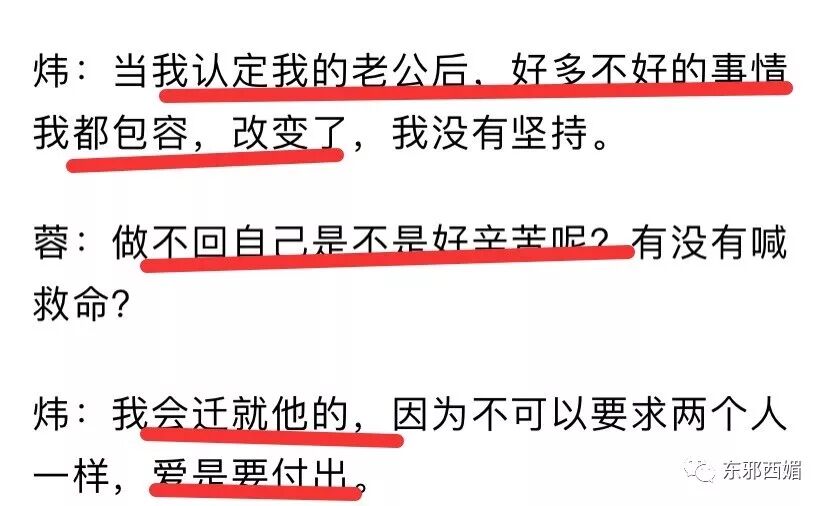 当时陈炜还在新婚期,她和陈法蓉谈起伴侣相处如何磨合适应。一般都会认为双方应相互包容,她却认为:不可以要求两人一样,爱就是要付出的嘛。所以,都由她单方来包容、改变、迁就。