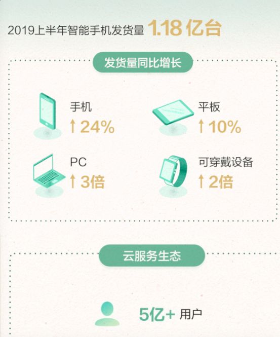数据显示,2019年上半年,华为的消费者业务收入2208亿元,占比55%。智能手机发货量(含荣耀)达到1.18亿台,同比增长24%;平板、PC、可穿戴设备发货量也实现了健康、快速增长;全场景智慧生态能力建设初具规模,华为终端云服务生态全球注册开发者已超过80万,汇聚了全球5亿用户。