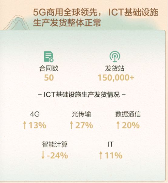 6 I0 l/ {- ]2 X6 P运营商业务收入1465亿元,占比36.5%。无线网络、光传输、数据通信、IT等生产发货情况总体平稳。目前,华为已在30多个国家获得了50个5G商用合同,累计发货超过15万个基站,全球领先。' S' f5 ]+ B% V3 T+ T1 j3 B
