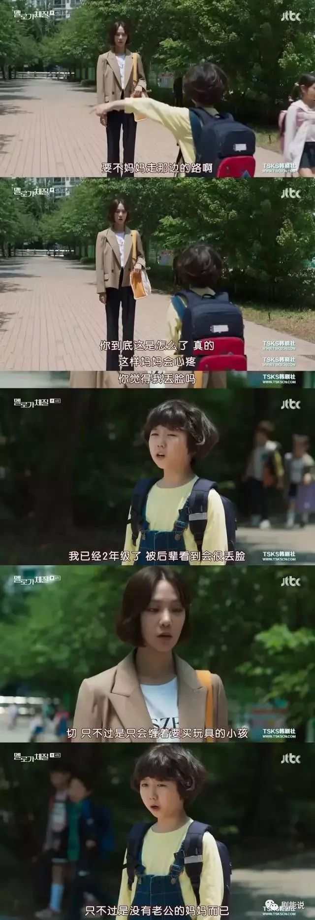 韩珠被小学2年级的儿子嫌弃,当她嘀咕着“不过是缠着买玩具的小孩子”时,孩子却对她说:“你不过是没老公的妈妈而已”。