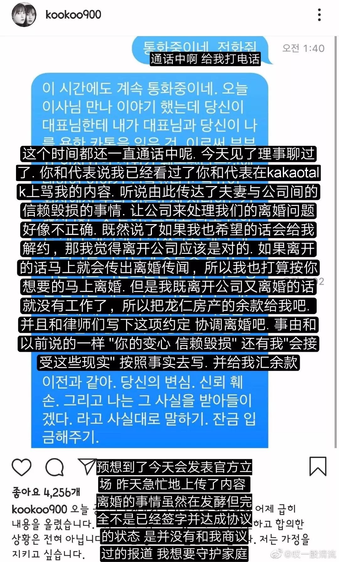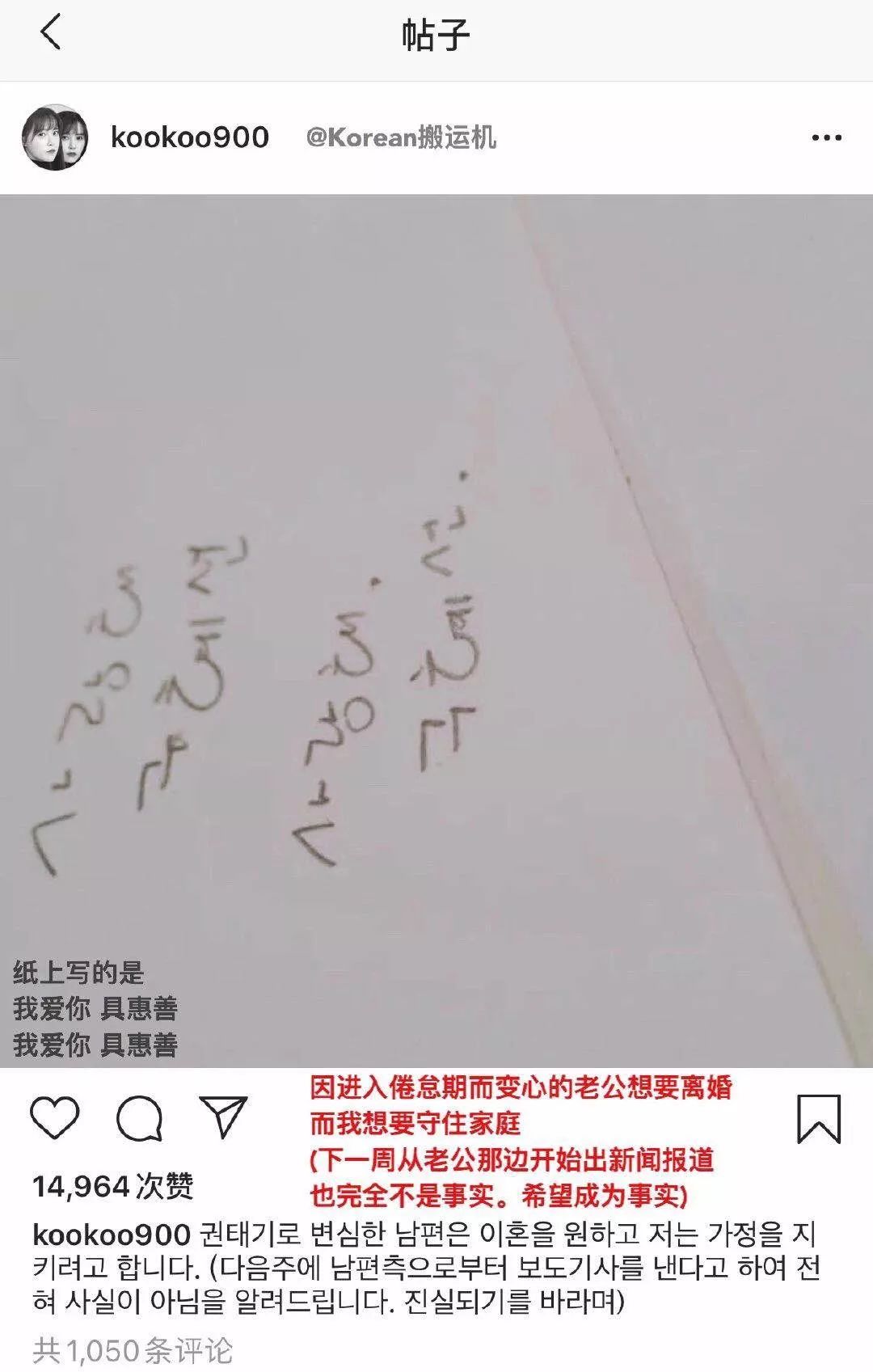 9 `) J: C! u. N- c& j- a/ ~5 ~/ l1 R; z先是具惠善单方面发了一条ins:“处于倦怠期而变心的丈夫想要离婚,而我想要守护家庭。(下周丈夫方面说要发出报道,我想告诉大家这根本不是事实,希望可以说实话)。”