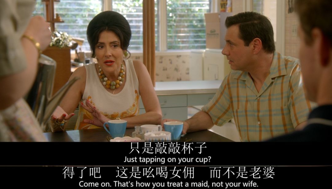 剧中有一个情节,当丈夫示意自己需要续杯时,他高傲地昂起头,只是轻轻敲敲杯沿,然后丢给贝丝一个“你懂得”的眼神。. W/ T' o9 s4 V. r! h, h) L5 h